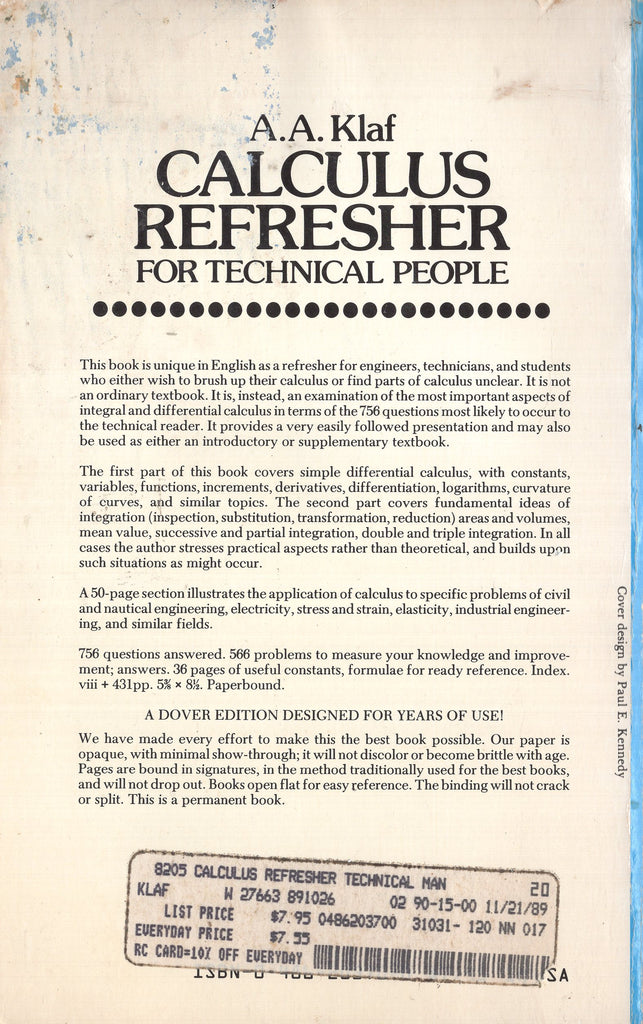 This book is unique in English as a refresher for engineers, technicians, and students who either wish to brush up their calculus or find parts of calculus unclear. It is not an ordinary textbook. It is, instead, an examination of the most important aspects of integral and differential calculus in terms of the 756 questions most likely to occur to the technical reader. It provides a very easily followed presentation and may also be used as either an introductory or supplementary textbook. The first part of this book covers simple differential calculus, with constants, variables, functions, increments, derivatives, differentiation, logarithms, curvature of curves, and similar topics. The second part covers fundamental ideas of integration (inspection, substitution, transformation, reduction) areas and volumes, mean value, successive and partial integration, double and triple integration. In all cases the author stresses practical aspects rather than theoretical, and builds upon such situations as might occur. A 50-page section illustrates the application of calculus to specific problems of civil and nautical engineering, electricity, stress and strain, elasticity, industrial engineering, and similar fields. 756 questions answered. 566 problems to measure your knowledge and improvement; answers. 36 pages of useful constants, formulae for ready reference.