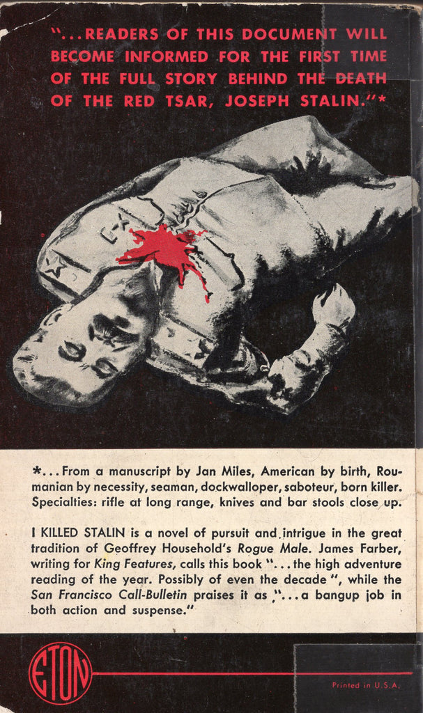 At the time this controversial novel was published in 1951, I KILLED STALIN was a daring, "near future" thriller, billed by the publisher as a "great fictional account of espionage and high adventure that throbs with the urgency of tomorrow's headlines." It was a high-wire act for author Sterling Noel that polarized critics, who either heaped him with praise and lashed him with scorn (for example, Harrison Smith, the President of the prestigious The Saturday Review of Literature called it "a barbarity...there may be others, besides this reviewer, who wish that it was never written. The book can be used by Russian propaganda to perpetuate the libel through the world that we are brutalized warmongers." Now it's an exciting read and, instead of being a futuristic thriller, it's an unusual time capsule of post-War America in the throes of the cold war.