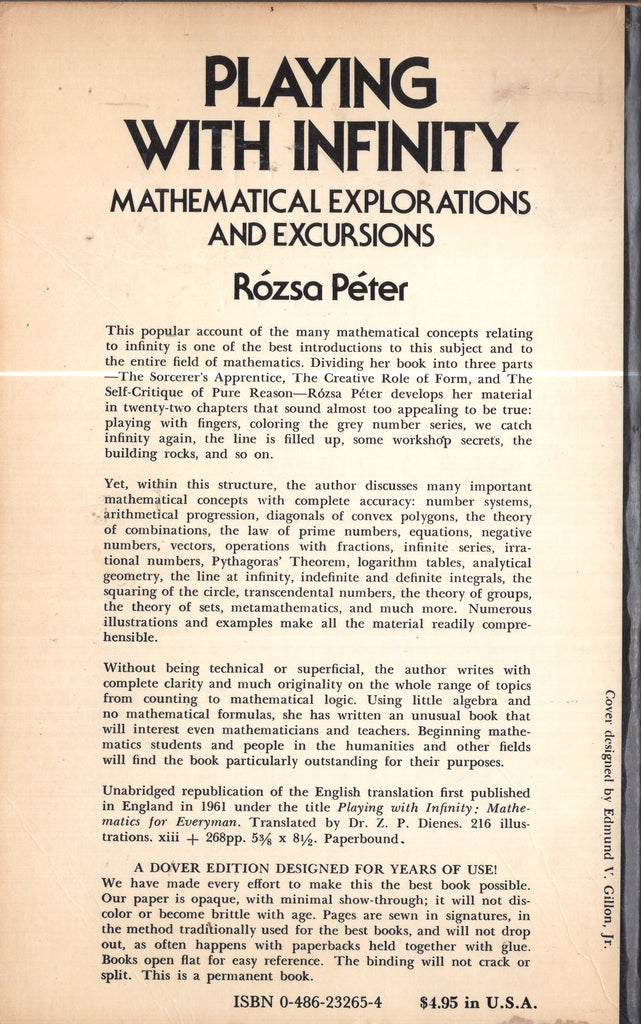 This popular account of the many mathematical concepts relating to infinity is one of the best introductions to this subject and to the entire field of mathematics. Dividing her book into three parts — The Sorcerer's Apprentice, The Creative Role of Form, and The Self-Critique of Pure Reason — Peter develops her material in twenty-two chapters that sound almost too appealing to be true: playing with fingers, coloring the grey number series, we catch infinity again, the line is filled up, some workshop secrets, the building rocks, and so on.
