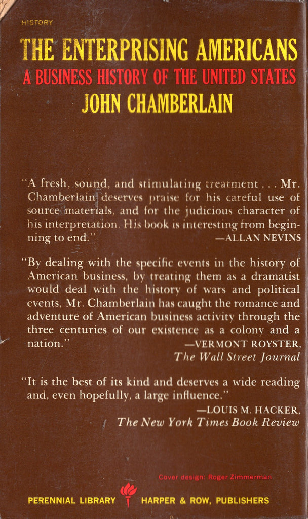 A Business History of the United StatesAbout the The Enterprising Americans is a lively and perceptive account of the growth of American business, from its mercantile beginnings in New England and along the Delaware and James River valleys to the great trade and industrial complexes which span the free world of today.Ever since the Revolution, and even before, the growth of American business has been an integral part of the growth of America. The Revolution was sparked by in fact, perhaps no other revolution in history was fought on such basically economic grounds. Although the colonists were fighting to maintain their ancient chartered grants of self-government, they considered their rights to trade and economic expansion a fundamental part of the historic "rights of Englishmen." After the Revolution, business continued to play its vital role in the growth of industry and invention, in the spread of the vast transportation networks which would link one section of country with another, and in the transition from an agricultural to a primarily industrial economy.The story concentrates on the creative moments of men of decision. Virtual unknowns such a Sir William Pepperrell take their place with the more famous Eli Whitney, Carnegie, Ford, and J.P. Morgan. This is the story of the cotton gin and the locomotive, of steel and oil and electronics. It is also the story of the American dream, of the poor young man who, through wit, daring, and ingenuity, makes his way to the top and leaves his imprint on the generations to follow.Mr. Chamberlain writes in a brisk anecdotal style, yet with scholarly insight, about a subject which should interest not only the businessman but every student of American life and history.The scope and vitality of the book are indicated by some of the may topics which it privateering in the coastal towns; the establishment of banking systems and the funding of a national economy; the development of a world-wide system of trade; industry, invention, and mass production; oil, steel, and the early trusts; the growth of money power; the creative as well as the destructive aspects of the men who have been called "robber barons"; the surprising expansion of business frontiers in the depressed Thirties - these and many others are the lively events which The Enterprising Americans recounts.Much of this book originally appeared as a series in Fortune magazine under the title " A History of American Business." Mr. Chamberlain received a special achievement citation for the series from the University of Connecticut Loeb Awards for business and financial journalism