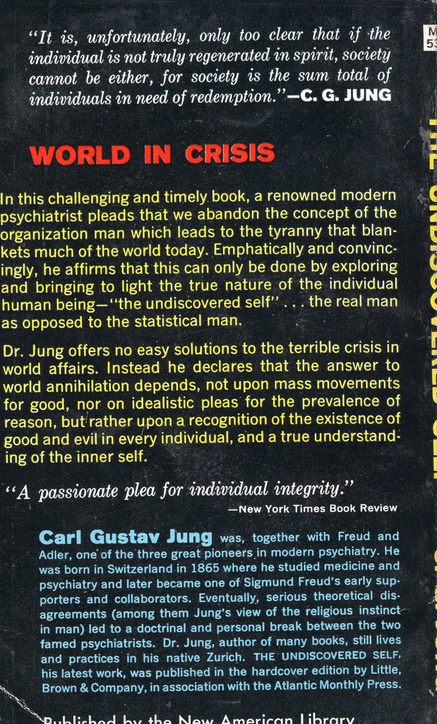 In this challenging and provocative work, Dr. Carl Jung—one of history’s greatest minds—argues that civilization’s future depends on our ability as individuals to resist the collective forces of society. Only by gaining an awareness and understanding of one’s unconscious mind and true, inner nature—“the undiscovered self”—can we as individuals acquire the self-knowledge that is antithetical to ideological fanaticism. But this requires that we face our fear of the duality of the human psyche—the existence of good and the capacity for evil in every individual.