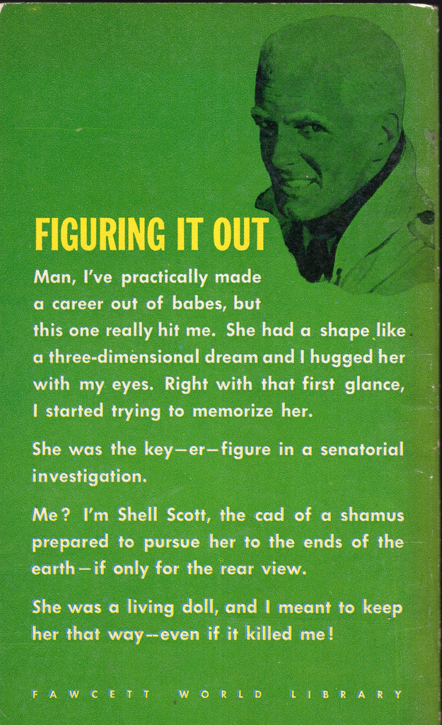 "She yanked the door open with a crash and said, 'Gran--,' but then stopped and stared at me. She was nude as a noodle. 'You're not Grandma!' I said, 'No, I'm Shell Scott, and you're not grandma either!' She slammed the door in my face. I've practically made a career out of babes, but this one really hit me. She had a shape like a three-dimensional dream, and I hugged that vision with my mind. Right from that first glance I had memorized her. She was the key - uhm - 'figure' in a sensational investigation leading all the way to the U.S. Congress. And me? I'm the shamus prepared to pursue both her and the clues to the ends of the earth, if only for the rear view. She's a living doll, and I mean to keep her that way, even if it kills me."