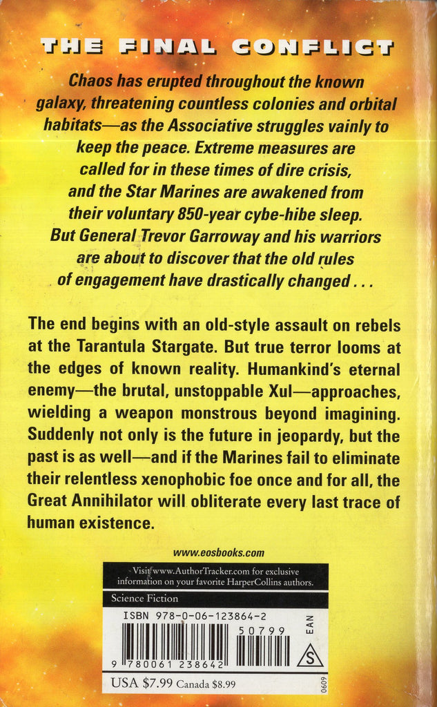 The end begins with an old-style assault on rebels at the Tarantula Stargate. But true terror looms at the edges of known reality. Humankind's eternal enemy—the brutal, unstoppable Xul—approaches, wielding a weapon monstrous beyond imagining. Suddenly not only is the future in jeopardy, but the past is as well—and if the Marines fail to eliminate their relentless xenophobic foe once and for all, the Great Annihilator will obliterate every last trace of human existence.