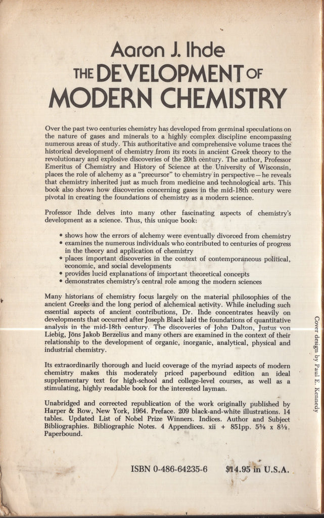 • demonstrates chemistry's central role among the modern sciencesMany historians of chemistry focus largely on the material philosophies of the ancient Greeks and the long period of alchemical activity. While including such essential aspects of ancient contributions, Dr. Ihde concentrates heavily on developments that occupied after Joseph Black laid the foundations of quantitative analysis in the mid-18th century. The discoveries of John Dalton, Justus von Liebig, Jöns Jakob Berzelius, and many others are examined in the context of their relationship to the development of organic, inorganic, analytical, physical, and industrial chemistry.Its extraordinary thorough and lucid coverage of the myriad aspects of modern chemistry makes the moderately priced paperbound edition an ideal supplementary text for high-school and college-level courses, as well as a stimulating, highly readable book for the interested layman.