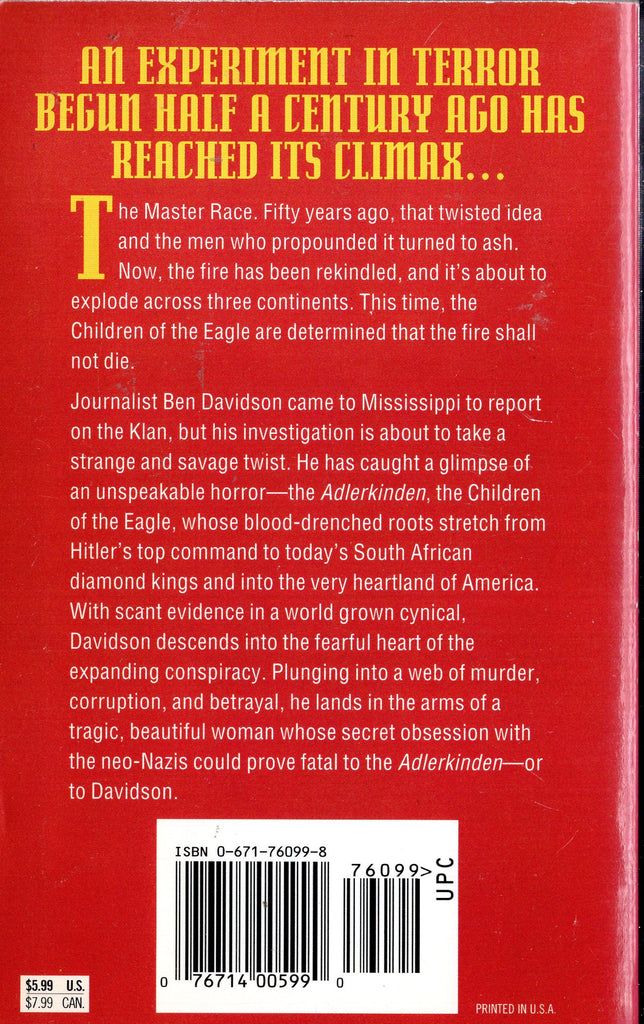 Journalist Ben Davidson came to Mississippi to report on the Klan, but his investigation is about to take a strange and savage twist. He has caught a glimpse of an unspeakable horror—the Adlerkinden, the Children of the Eagle, whose blood-drenched roots stretch from Hitler’s top command to today’s South African diamond kings and into the very heartland of America. With scant evidence in a world grown cynical, Davidson descends into the fearful heart of the expanding conspiracy. Plunging into a web of murder, corruption, and betrayal, he lands in the arms of a tragic, beautiful woman whose secret obsession with the neo-Nazis could prove fatal to the Adlerkinden—or to Davidson.