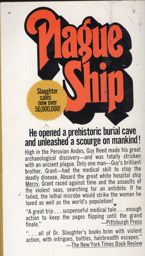 This is the story of one man in par­ticular—Dr. Grant Reed and the dedi­cated crew of the international hospital ship Mercy, as they set about the task of quarantining the first victims of a hideous plague. Set adrift by frightened Peruvians, the aging and crippled ship faces a hurricane, mutinous patients, and even a pair of great white sharks, grisly mascots of a ship of death. . . .