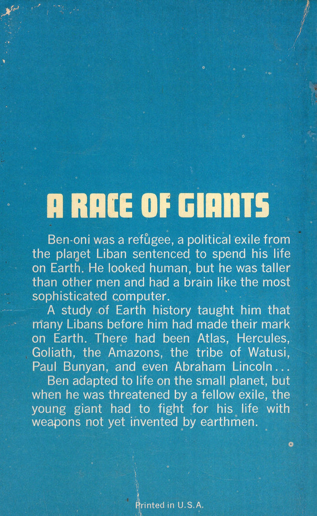 Ben-oni was a refugee, a political exile from the planet Liban Ben-oni's punishment was brutal --lifelong exile to the planet Earth, solar system #92, continent of North America. He looked human, but he was taller than other men and had a brain like the most sophisticated computer. A study of Earth history taught him that many Libans before him had made their mark on Earth. There had been Atlas, Hercules, Goliath, the Amazons, the tribe of Watusi, Paul Bunyan, and even Abraham Lincoln... Ben adapted to life on the small planet, but when he was threatened by a fellow exile, the young giant had to fight for his life with weapons not yet invented by earthmen.
