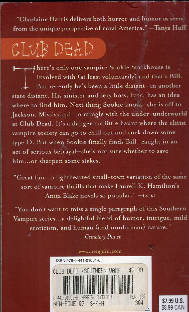 There’s only one vampire Sookie Stackhouse is involved with (at least voluntarily) and it’s Bill Compton. But recently he’s been a little distant—in another state, distant. Then his sinister and sexy boss Eric Northman tells Sookie where she might find him. Next thing she knows, she’s off to Jackson, Mississippi, to mingle with the under-underworld at Club Dead, a dangerous little haunt where the elite of vampire society can go to chill out and suck down some Type-O. But when Sookie finally finds Bill—caught in an act of serious betrayal—she’s not sure whether to save him...or sharpen some stakes.