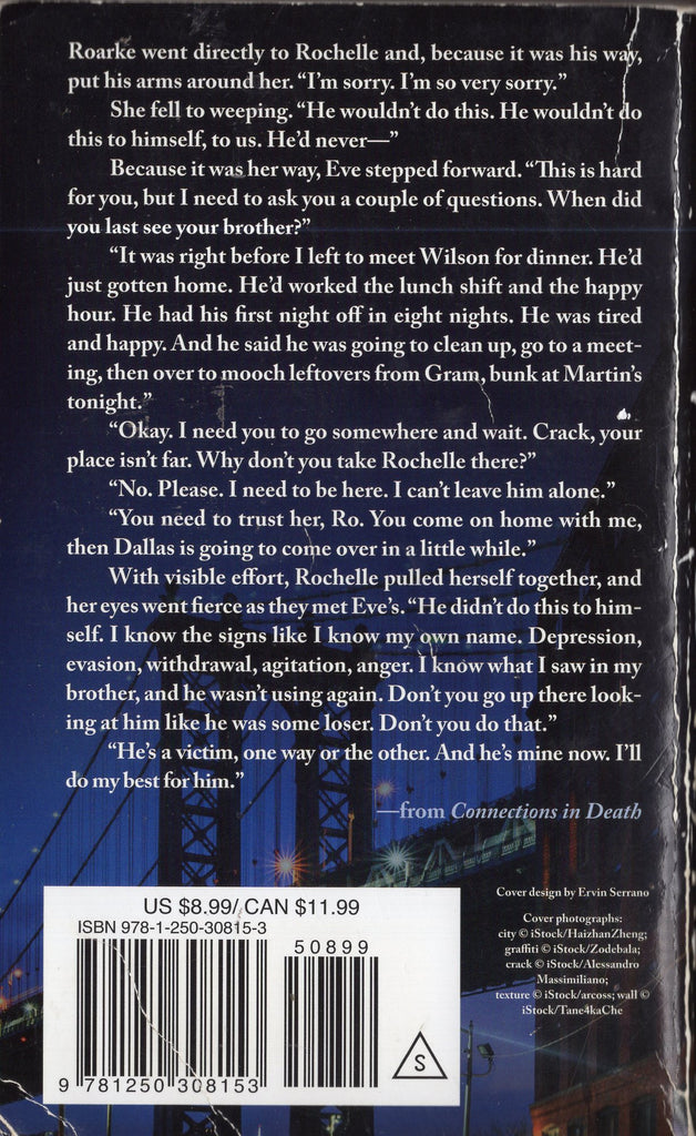 Now Eve and Roarke must venture into the gang territory where Lyle used to run, and the ugly underground world of tattoo parlors and strip joints where everyone has taken a wrong turn somewhere. They both believe in giving people a second chance. Maybe even a third or fourth. But as far as they’re concerned, whoever gave the order on Lyle Pickering’s murder has run out of chances…