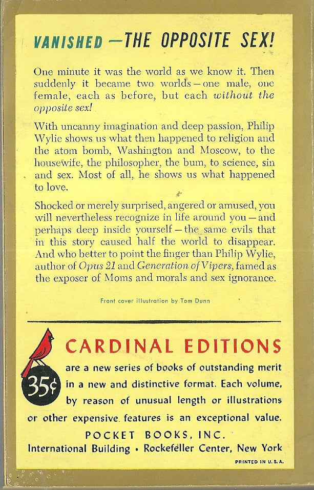 Comments: “The female of the species vanished on the afternoon of the second Tuesday of February at four minutes and fifty-two seconds past four o'clock, Eastern Standard Time. The event occurred universally at the same instant, without regard to time belts, and was followed by such phenomena as might be expected after happenings of that nature.”