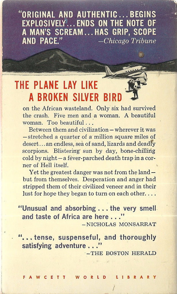 To the desert came the plane, to the immeasurable wastes of Africa. And by the dawn of the second day―after the night storm, the hours of flight, the crash, the day of waiting, and the death of Detjens―six remained, alone, strangers, with only themselves and the wreckage and the black mountain on the horizon for company. The six: Sturdevant, the pilot, burdened with a guilt far greater than the loss of his plane; Grimmelmann, the wizened old German, veteran of the Herero war and the two World Wars, wise in the lore of the desert and the ways of the world; Jefferson Smith, a Negro, a professor and a scholar, come to Africa on a Foundation grant; Mike Bain, engineer, drifter, drunkard, vaguely in search of a job in the interior, ill-equipped to cope with the demands of the desert; Grace Monckton, English divorcee, returning to her family's ranch in the Union; and finally, O'Brien, a man of great strength, sometime millionaire, sometime wanderer, a hunter by instinct and by choice. The six, brought together by chance, and with the odds of survival overwhelmingly against them, have only each other, for both friend and foe. Around them is the desert―implacable, pitiless, filled with unseen enemies. And on the horizon is the black mountain, beyond which is hidden the unknown.